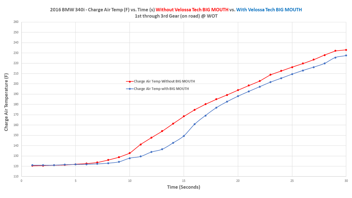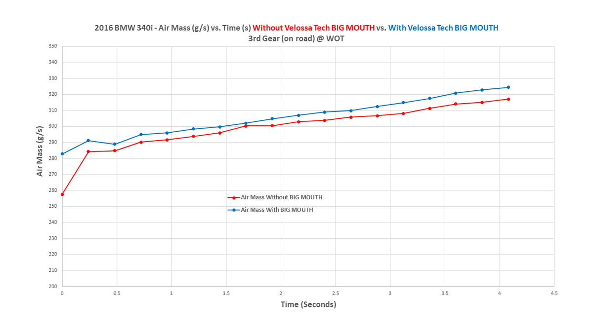 Performance logs (please see picture gallery) on a 2016 BMW 340i (similar platform and inlet geometry) prove measurable gains under consistent conditions.
