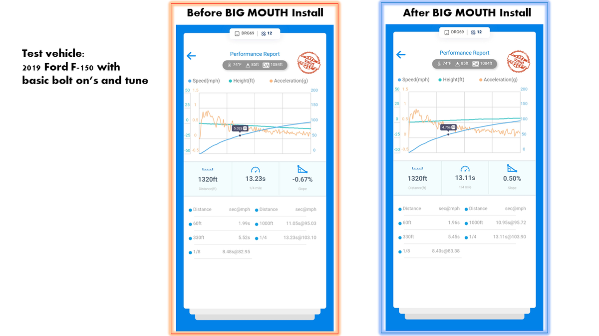 Performance logs (please see picture gallery) on a 2019 Ford F-150 prove measurable gains under consistent conditions.Â